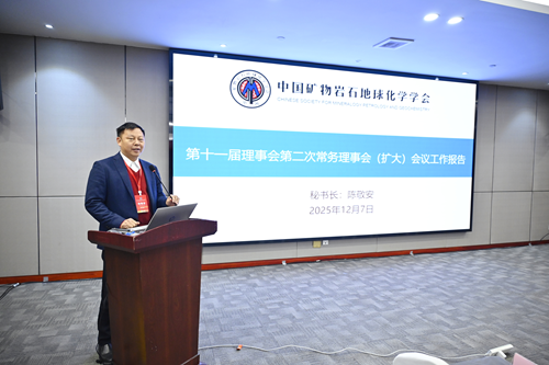 中国矿物岩石地球化学学会(以下简称“学会”)于2025年12月7日下午在贵阳召开第十一届理事会第二次常务理事会(扩大)会议。学会名誉理事长、常务理事及部分理事、监事、分支机构主任委员、副秘书长、秘书处工作人员等近百位代表出席。会议由理事长冯新斌研究员主持。